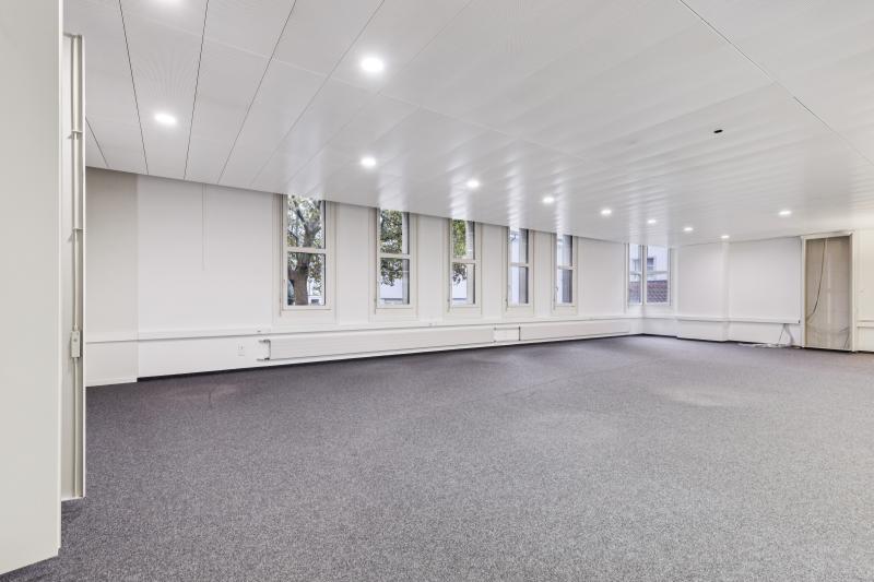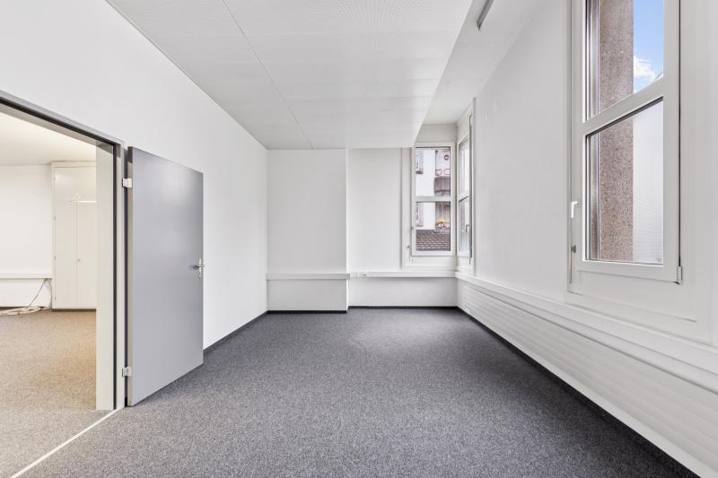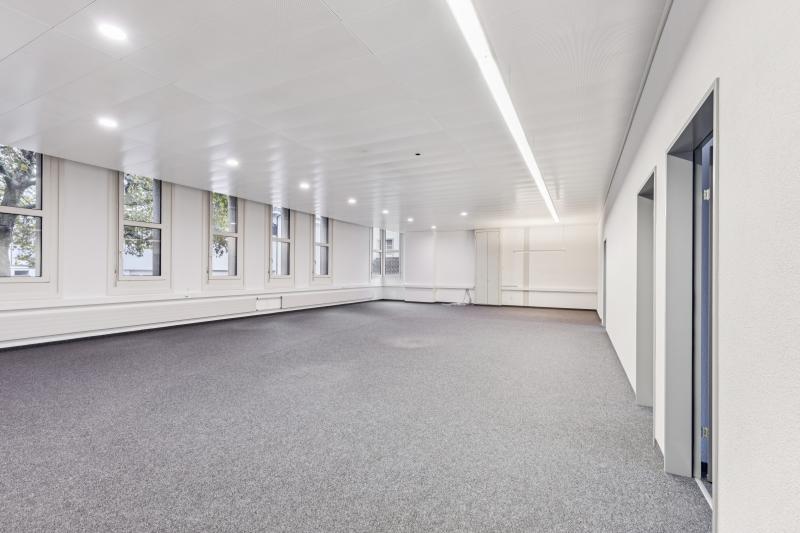 Cet espace de bureau de 175 m² situé au rez-de-chaussée dispose d’un aménagement bien pensé, comprenant une grande zone de travail ouverte ainsi qu’un petit bureau séparé, idéal comme salle de réunion, bureau individuel ou espace de retrait. Le sol en moquette crée une atmosphère de travail agréable, tandis que les nombreuses fenêtres assurent une lumière naturelle abondante et une ambiance chaleureuse.